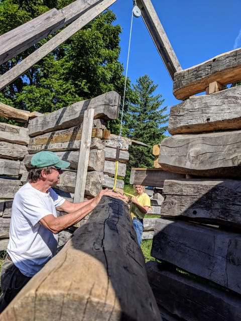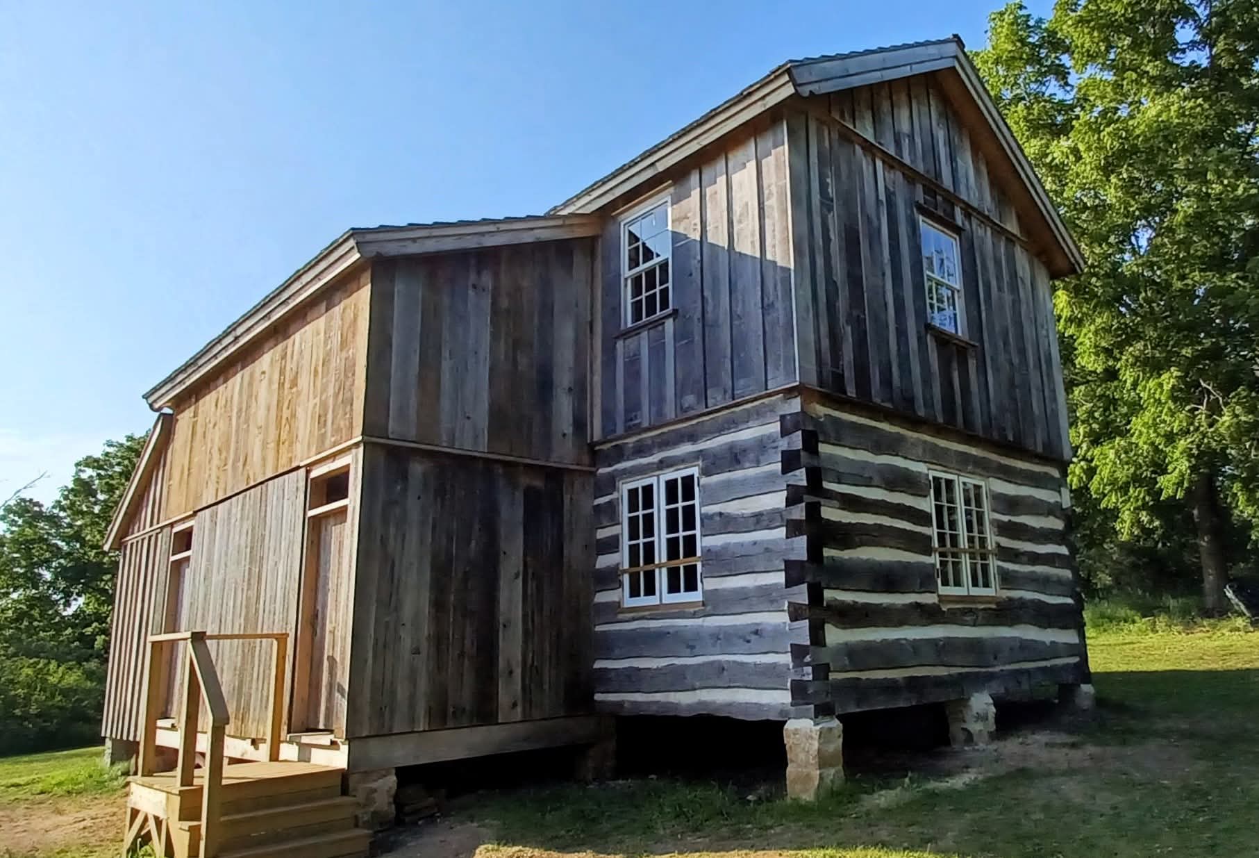 In 2018, I helped cut and fit some of the first dovetailed logs at the base of the structure. Years later, a Wisconsin Folk Arts grant supported us in building ten double-hung windows completely by hand. And just this spring, I referenced a surviving original door to build two new doors that finally seal the cabin’s exterior.