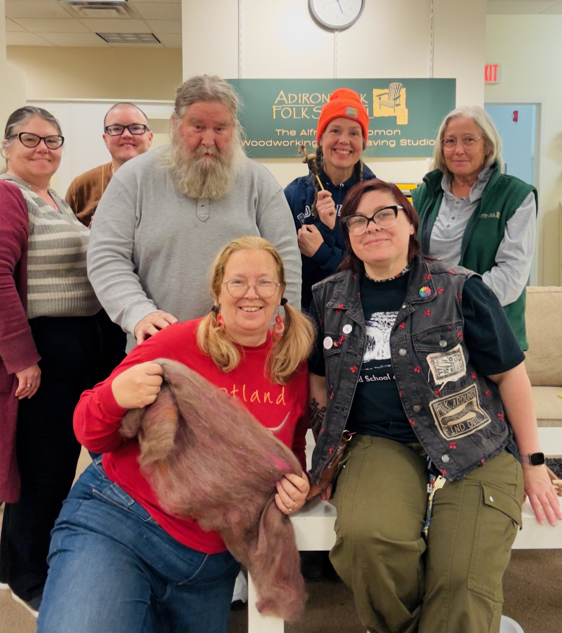 Mathilde Lind (bottom right) with their November 2025 Fleece to Yarn class at the Adirondack Folk School in Lake Luzerne, New York.