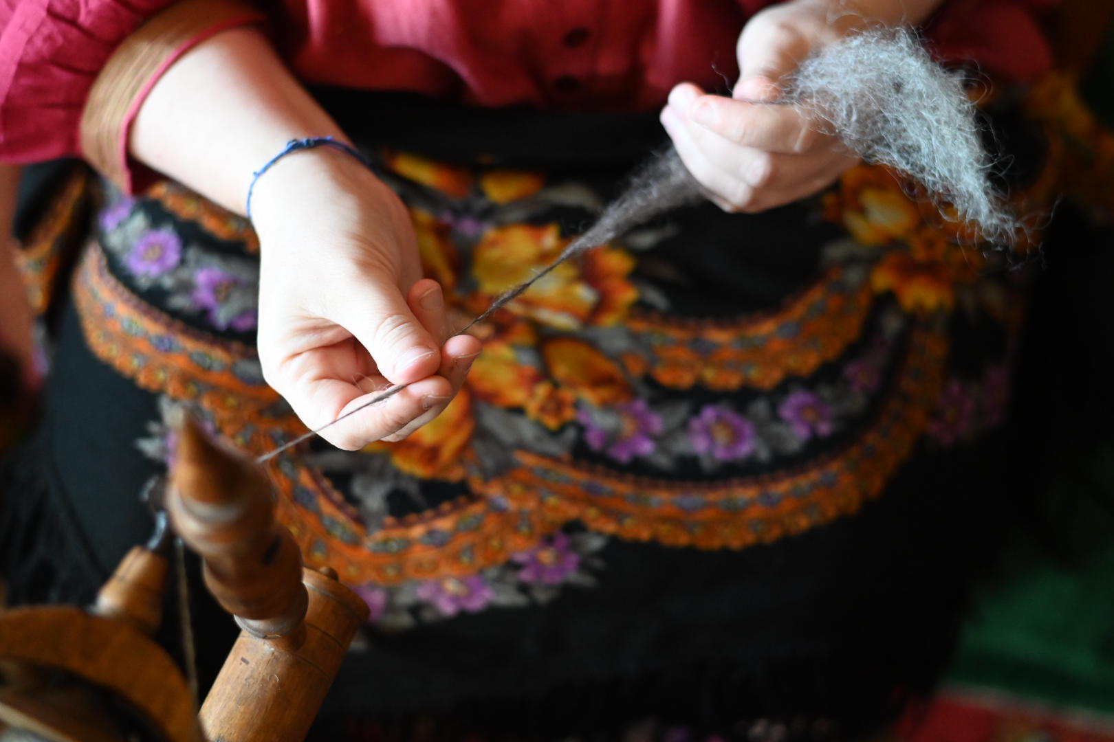 Spinning Kihnu native sheep wool on an Estonian spinning wheel.
