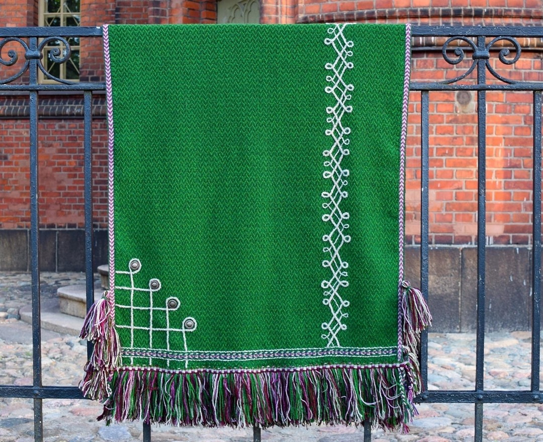 Sõba with tablet weaving, supplemental fringe, tassels, metal embellishments, and couched handmade cordage. Made and photographed by author.