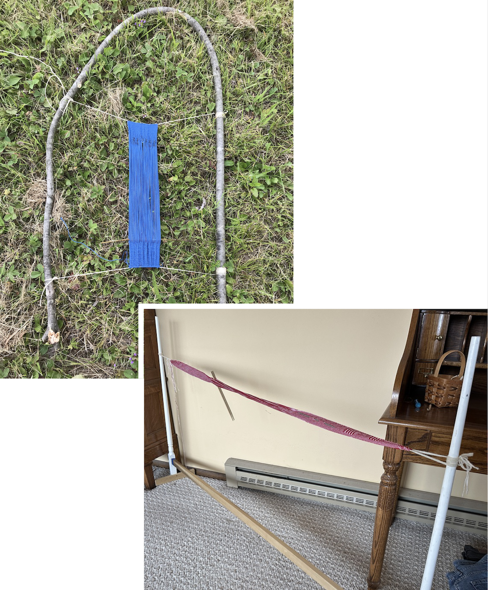 There are SO many design possibilities with very few tools required. The only equipment required to work sprang is a frame to hold the threads taut, fingers, and a couple sticks to keep your place. The frame can be as simple as a bent stick or two vertical posts (though I usually use the modern frame in the first photo). And with such a simple setup, I can make a wide range of designs.