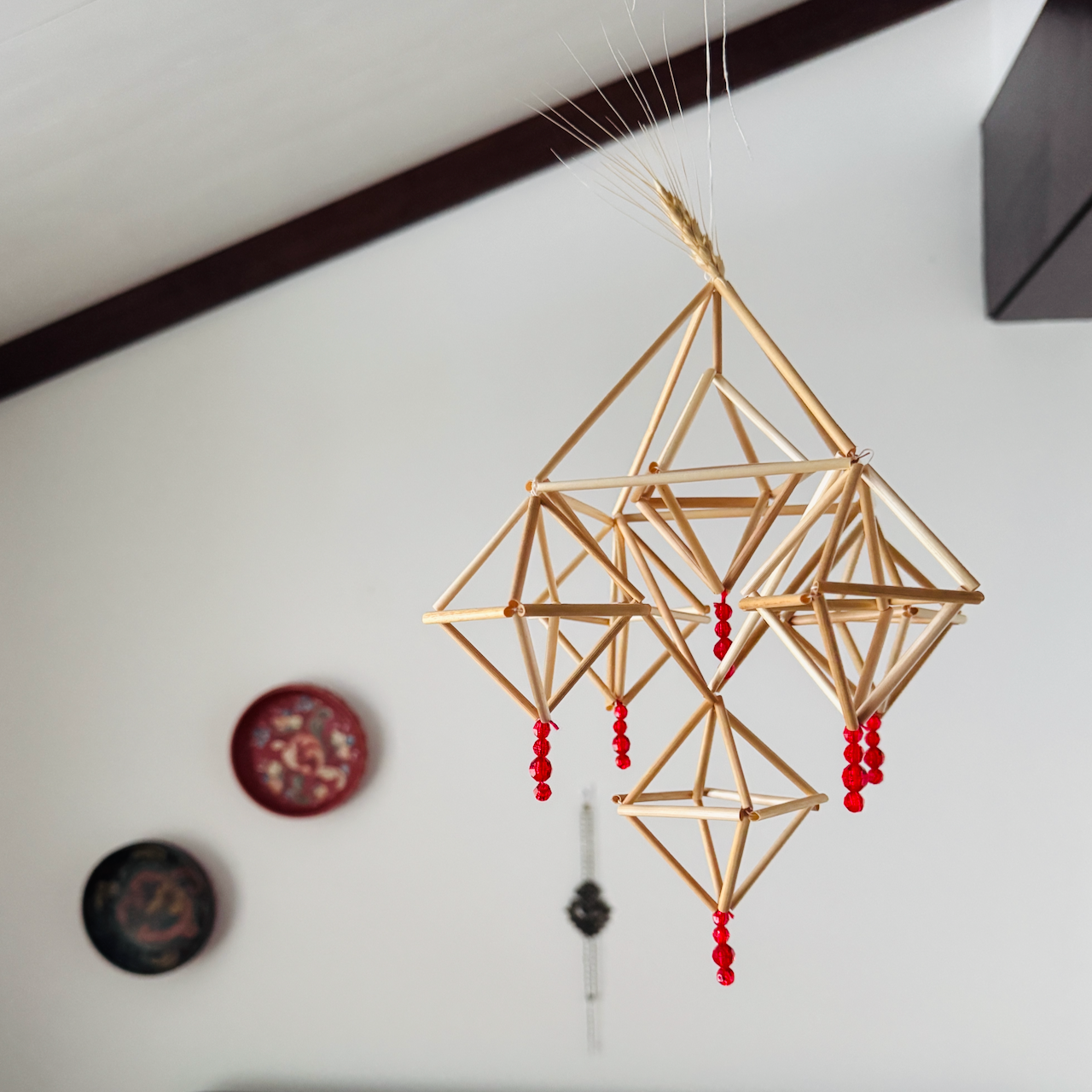 My love of straw and reed mobiles took me by surprise. I usually go in for more practical, everyday crafts, like spinning sturdy wool yarn or weaving commonplace fabric for hardwearing clothing. However, as a folklorist, I find these mobiles fascinating. I love the traditions of bringing a sheaf or even loose straw into the home to ensure prosperity for the coming year. Often, this was the last sheaf (sometimes the first sheaf) of the harvest, which was thought to have magical properties in many different cultures. In Ukraine, such unthreshed ears of grain are tied in decorative bundles resembling a world tree and are called didukh: forefather, grandfather, ancestor. In Norway, straw is scattered on the floor during the Christmas season, and the first sheaf of grain, the julenek, has particular significance. Similarly, in Finland, straw was also scattered on the floor and made into small ornaments representing the sun, moon, and stars. Winter is a traditional time for making mobiles, and they are often burned later at Epiphany (today, as I write this) or even at Midsummer to ensure fertility and prosperity for the coming year. However, many mobiles escaped the flames, and one can find beautiful historical examples in museums across the region.