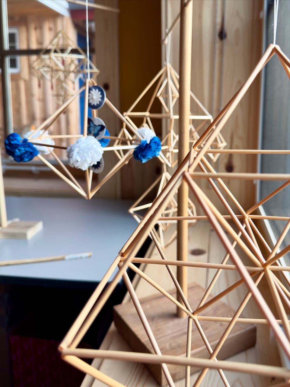 As a middling sort of mobile maker, I was self-taught and limited to simple forms. However, I was fortunate that North House hosted a class on himmeli in October, just a month into my residency, and I was able to step in as a classroom assistant. The instructor, Mary Erickson, is a delight; in addition to being a skilled artisan, she is passionate and knowledgeable about the history and culture of himmeli and other similar mobiles. In the class, I constructed two mobiles from straw, one of which I decorated with birch bark beads that I made in an earlier North House workshop with Beth Homa Kraus.