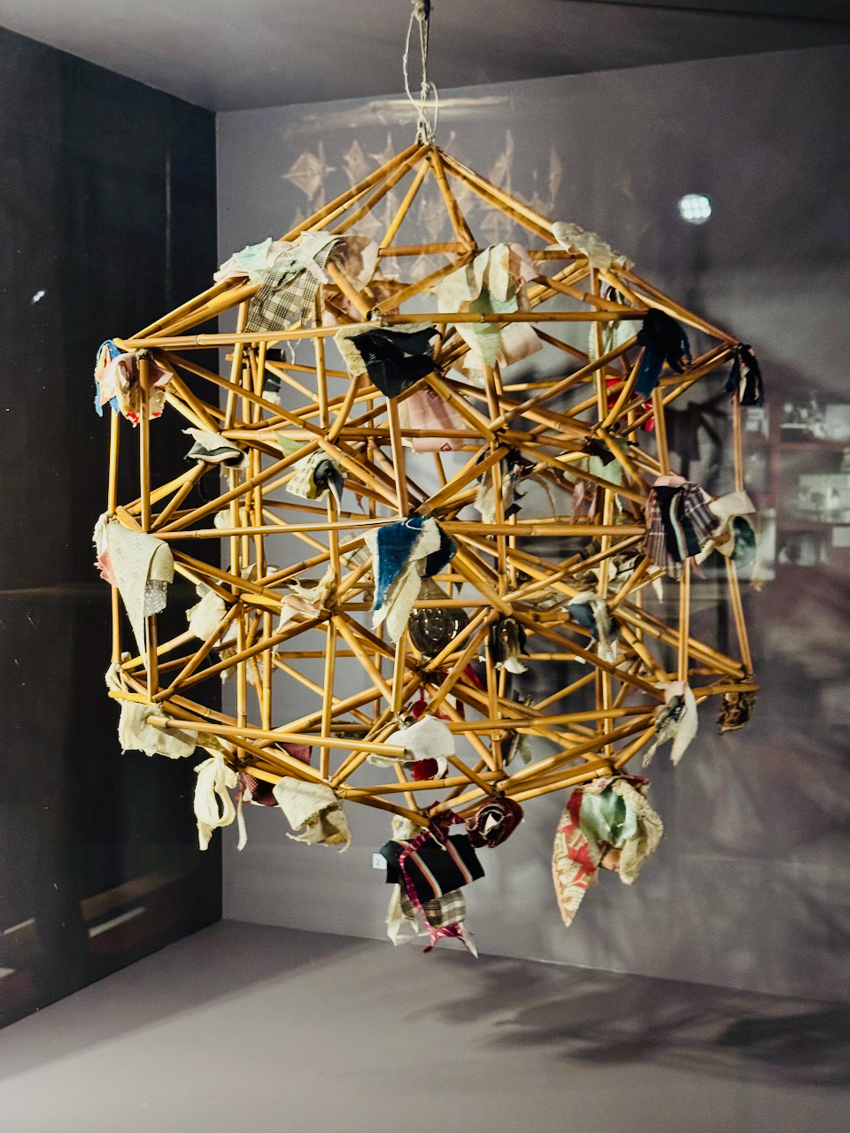 I also have been inspired by the different shapes and ornamentation we see in the many local variants of this ancient craft. The record-breaking pavuk in Kharkiv is a great example. Rather than the extremely regular shape of the largest rookroon, it has a swooping, asymmetrical form with many smaller pavuky hanging from it, accentuated with red tassels. I also love the inclusion of fabric scraps and eggs in this halmkrona from Rågö. One of my favorite unusual mobiles was featured in the ERM exhibition. From the aibofolk community of Vormsi island (Swedish: Ormsö), it consists of a sort of wooden wheel from which innumerable gods' eyes are suspended.