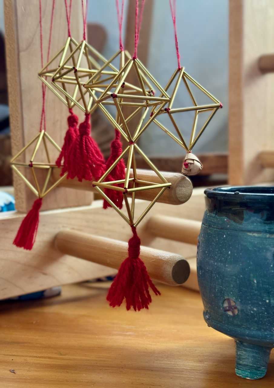 Inspired by these experiences, I have taken a mobile-making detour in my craft, and I have been experimenting with different materials and scales. I made a batch of simple ornaments for the North House store using brass tubes and red wool tassels; they are small and fairly durable, a little more reasonable to transport and keep than a fragile straw construction. I am currently working on even smaller ones for jewelry. The big challenge is making sure that the joints are neat and consistent, as the beauty of the pavuk comes from its harmony, the many small pieces forming intricate, precise geometric shapes that cast complex shadows as they spin.