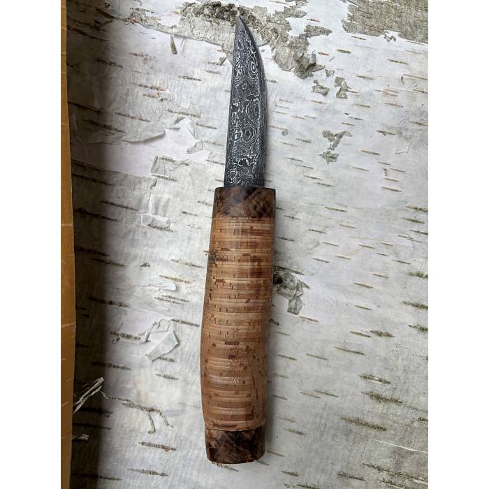 Damascus Blade with Birch Bark Handle and Leather Sheath
