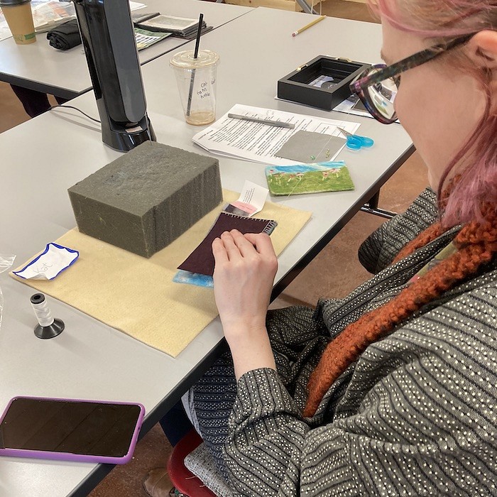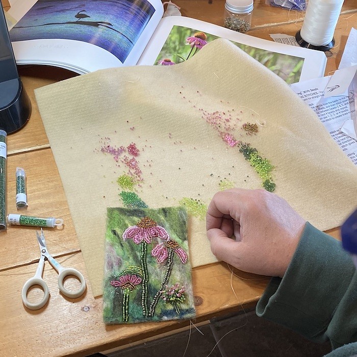 This advanced course is open to those who have taken Jo’s bead and felt class and to students who have experience with both two-dimensional needle felting and bead embroidery. In this three-day course, each student will focus on creating a single piece. At the end of the course, they will frame their work. This is an opportunity to learn more about blending colors of wool for felting and to try a variety of bead embroidery techniques.