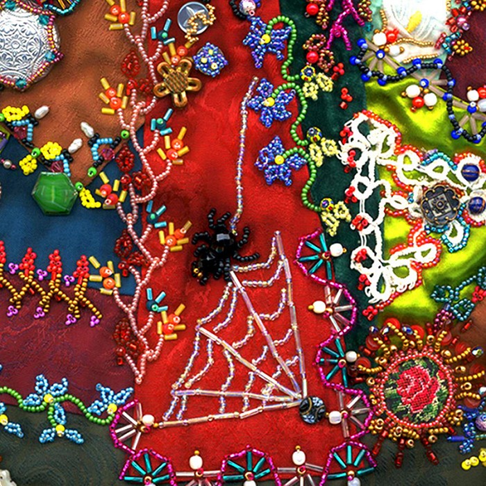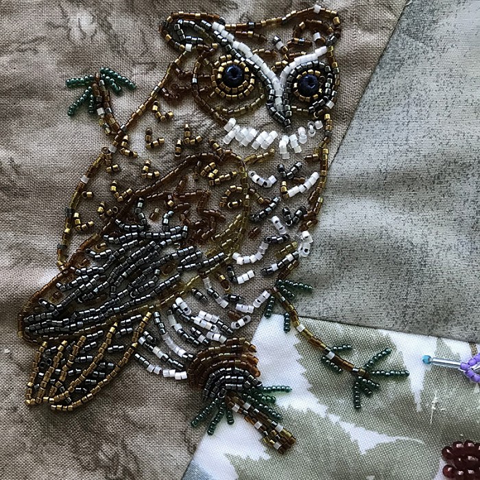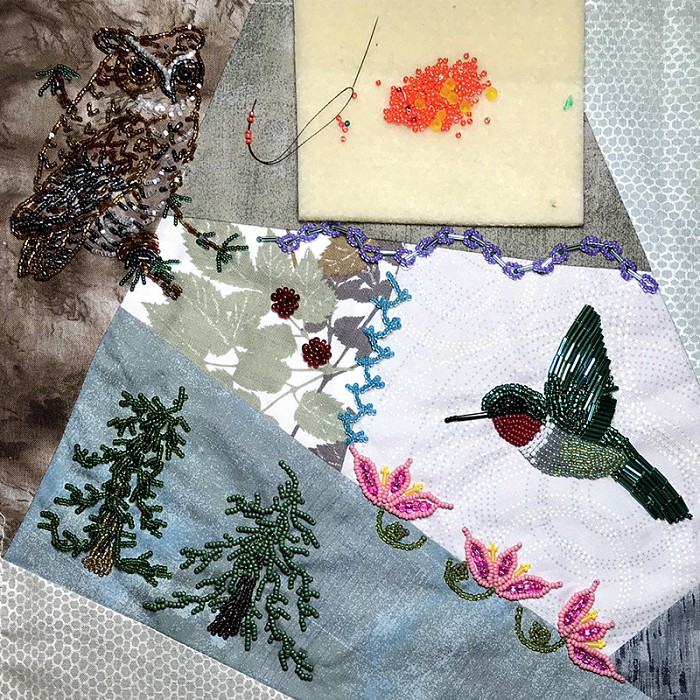 The instructor will teach her unique copyrighted method using small glass beads to recreate traditional thread embroidery stitches to embellish the fabric segment seams. We will also learn several methods for making large beaded imagery as we bead creatures native to the woodlands. Then discover numerous fabric beading stitches to create dainty flowers, leaves, vines, and raspberries. Students will make a small beaded crazy quilt they will take pride in, and will gain the knowledge of beading stitches and techniques that can be used over and over again on future fabric-based beading projects.