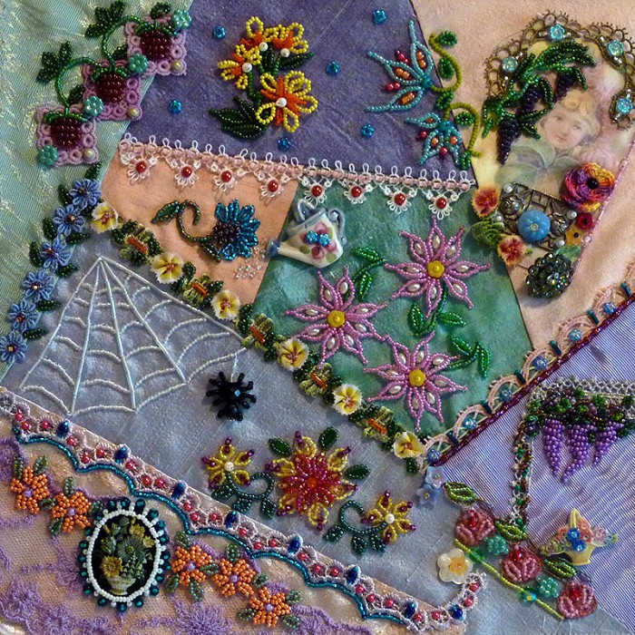Drawing inspiration from opulent hand-embroidered Victorian Crazy quilts; learn how to construct a traditional 14-inch Crazy quilt block using the stitch and flip sewing method on a muslin base. Traditional Crazy quilts were not constructed for warmth or for the bed; instead they showcased the maker’s needlework skills. The hand-beading needlework skills will be taught in this class.