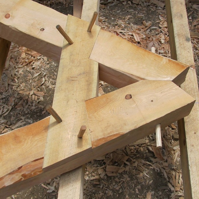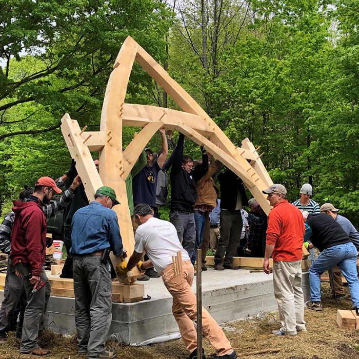 Cruck building is a Medieval English method of timber framing using pairs of large, curved timbers (cruck blades) that are joined at their apex to function as both post and principal rafter. The resulting Gothic arch creates a dramatic open hall space that is both structurally stable and visually appealing. Working with these naturally curved components to create a plumb, square, and level structure can be challenging for the carpenter. So, while class will work from drawings, the actual shapes of the cruck blades will determine how they can be best framed as the work progresses. Using primarily the French plumb-line method, fitting these naturally curved components will use a combination of “square ruled” and “scribed” techniques. Students will also hew or saw the edges of crucks, collars, and braces to a graceful curve, split out Pins (pegs) with a froe to dress them on the shaving horse with a drawknife, and culminate class with a hand-raising and a “topping out” ceremony.