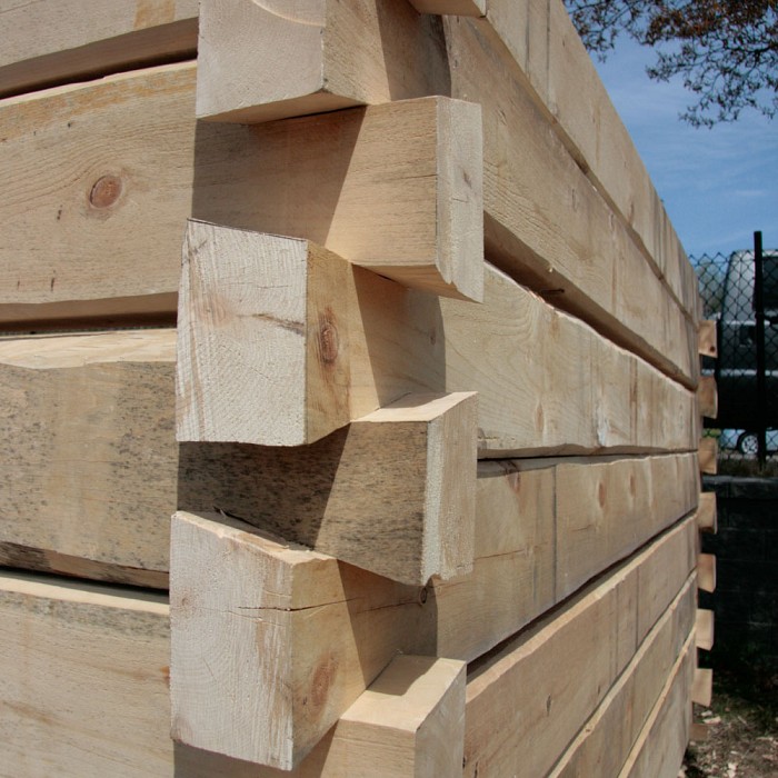 Traditional dovetail log homes, also known as American heritage and Appalachian log homes in the United States, began to emerge in the 1700s as a sturdy abode of our ancestors. The walls were traditionally made of logs hand hewn into square timbers (sizes varied based upon logs available) and joined at the corners with a weather-resistant half-dovetail notch. This authentic design allows the weight of the building to pull the timbers tightly together for stout, tight joinery. The spaces between the timbers were historically filled with an array of clay, mortar, moss or oakum. Today's construction includes varied thicknesses of timbers, foam backing rod for filler, and flexible latex chinking. The rustic dovetail joinery and white pine timbers reflects the quality construction of those bygone days.