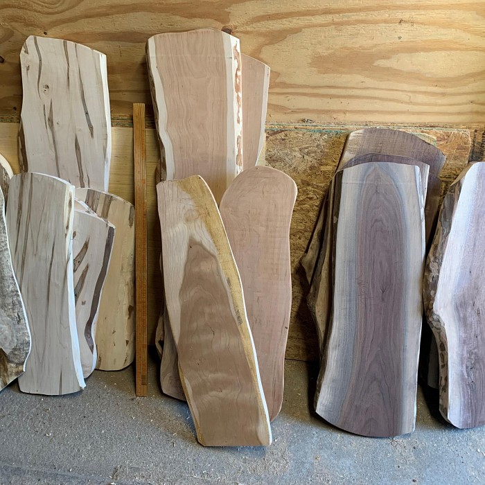 Dimensions of slabs will be roughly 12 inches wide by 3 to 5 feet in length and 1.25 inches in thickness. Expect curves, color, pattern, and wavy edges. Many of these slabs will be from the outer edge of the log where bugs and bacteria have been hard at work making unique colors and excavations. All turnings for legs and stretchers will be provided. Choose from cherry, walnut, or ambrosia maple.