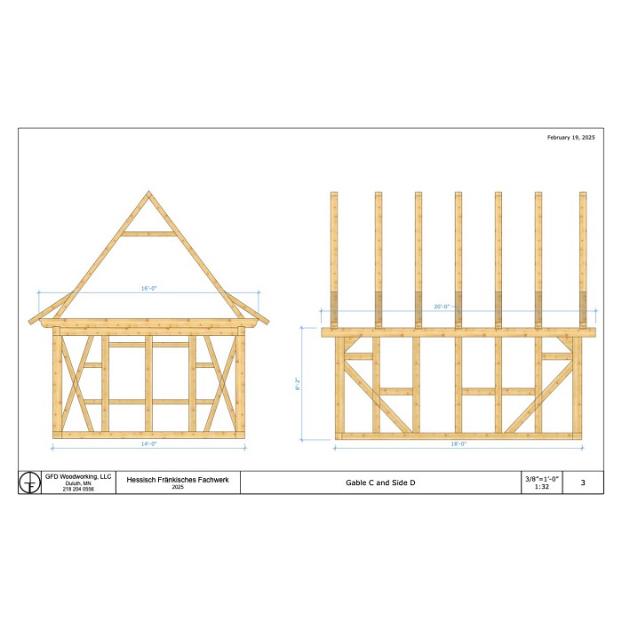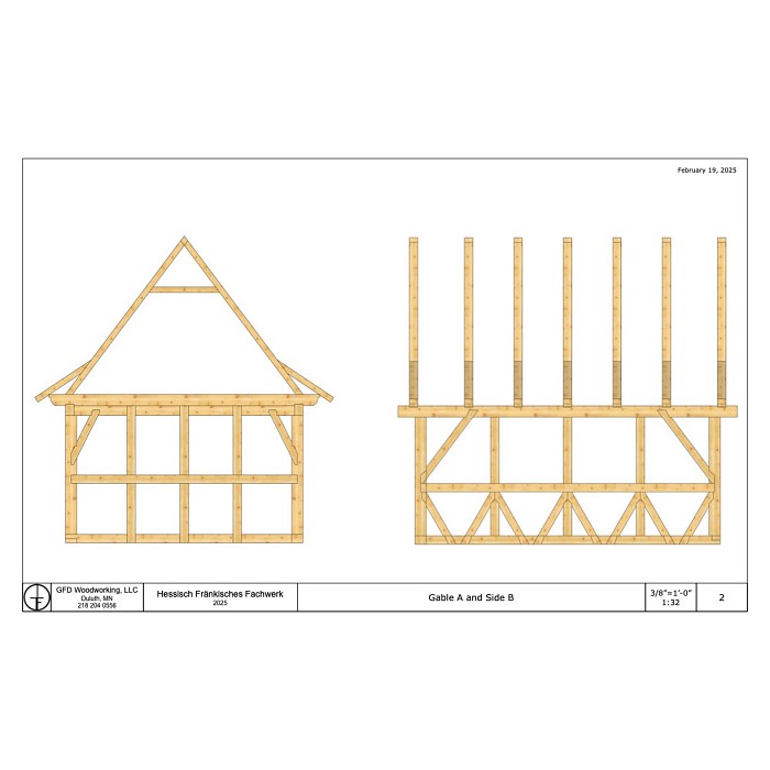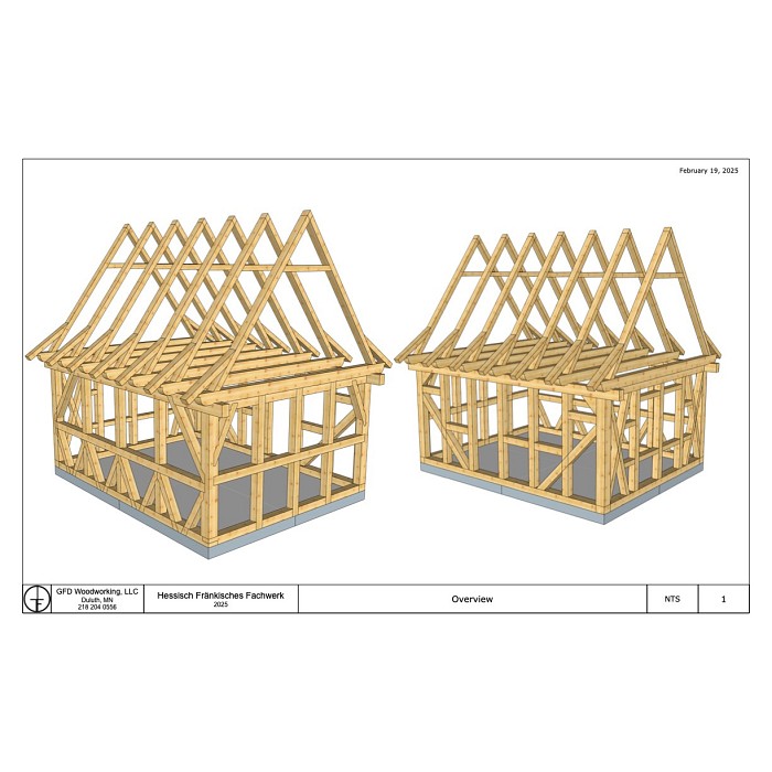 German Timber framing of the Hessen and Franconia region (roughly from Kassel in the north to Heilbronn in the south, Koblenz in the west to Fulda in the east) went through significant changes between the 14th and 16th centuries. The general style of bracing arrived at by 1550 and remained in use until the 1800’s, with endless variations. The frame we’ll construct in this class is designed to be a Fachwerk history lesson, with each side of the building exhibiting the joinery of a different stage of this transitional period. Window arrangements and bracing styles will be different with each face, as will the joinery, with the mortise and tenon gaining favor over the half lap. The roof will be a steep “Sparrendach” with rafter pairs joined by a collar beam and a ceiling beam for a simple triangle shape. Extra roof overhang is gained with rafter sprockets.