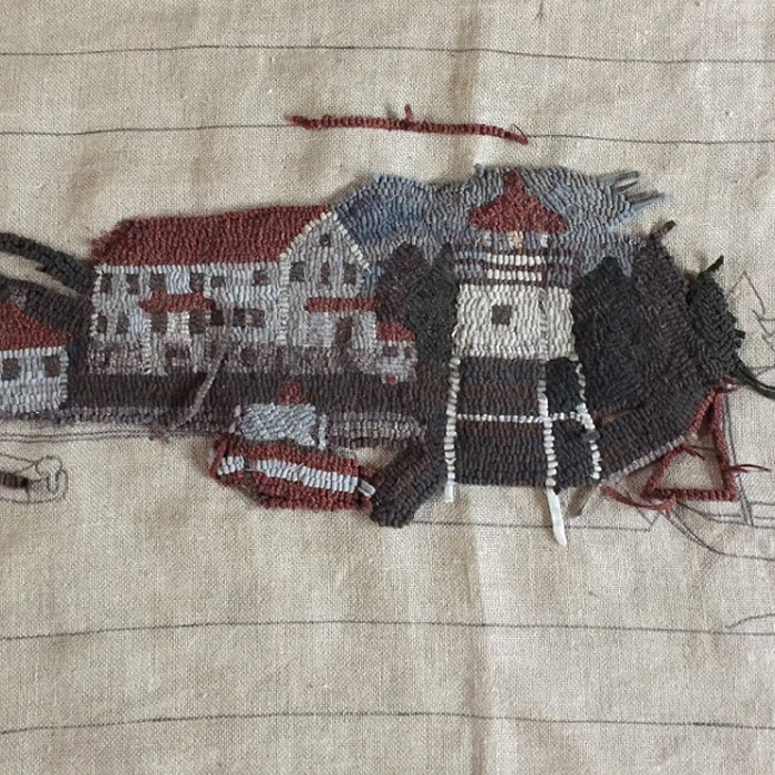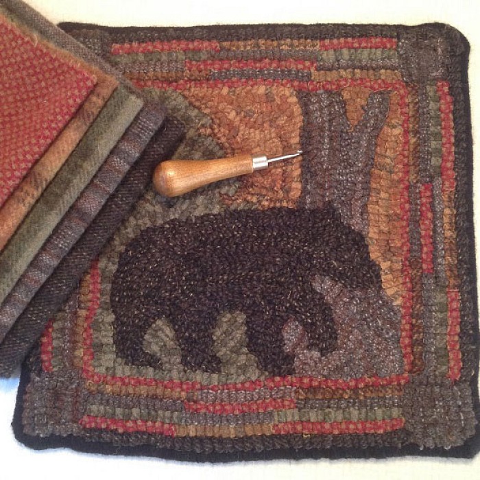 Rug hooking traces its roots to the northern colonies and Canada when immigrants utilized textiles on hand to create rugs for their homes. Hooked rugs are made by drawing narrow strips of wool fabric through a background fabric of cotton, linen, or burlap with a curved hook much like a crochet hook.