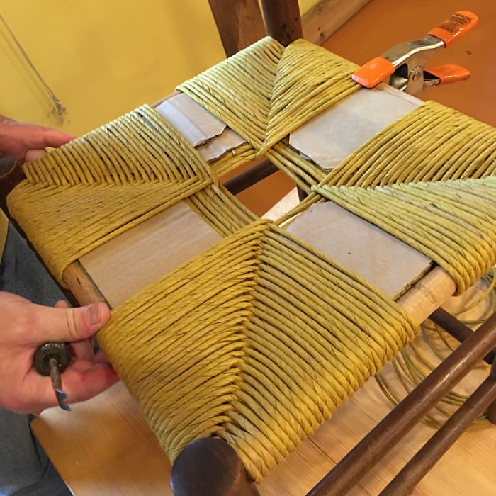 Most likely you’ve seen this type of weaving done on antique and flea market chairs and always wondered how it was done. In this two-day course you will learn how to weave the rush seat design pattern, which forms four distinct triangular envelope shapes that meet in the center. Students are encouraged to bring their own post and rail chair frame, but by prior arrangement, a vintage chair can be purchased from the instructor. You will be using a continuous strand of rolled paper rope, a product that was invented in the early 1900s and made to resemble the hand-twisted natural bulrush or cattail leaves found in older chair seats. The instructor will show you the tricks of the trade to speed and improve your weaving process. Take home a completed chair and a new interest. If your bring a chair, the paper rush material only will be approximately $25-$35, payable to the instructor. If purchasing a chair from the instructor, total material fee for the chair and material will be $75. Moderate hand strength is needed and there is repetitive movement with the technique.