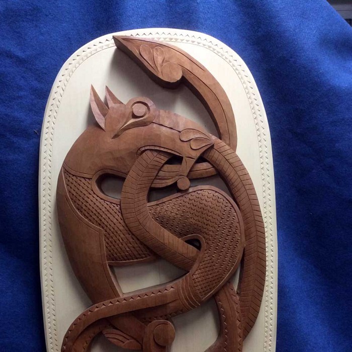 The 1904 excavation in Norway of the Oseberg Viking ship revealed a vast array of woodcarvings, unlike anything seen previously. Dragon-like head posts, elaborately carved sleighs, an exquisite wagon, and of course, the carvings on the ship itself revealed the extent of the imagination and skill of woodcarvers in the 9th century region of Vestfold, Norway. Instructor Jay Haavik has spent years studying and replicating the carvings of the Oseberg ship and has vast knowledge of the tools, techniques and motifs of this long-ago world. This five day workshop will be an opportunity for beginning as well as practiced carvers to experience the pleasure of making carvings inspired by the Viking age. Beginning students will spend the first day learning basic carving skills, including practice using knives, gouges and chisels, learning about grain direction, sharpening, creating smooth surfaces, and of course, safety, and then will make one or more simple, yet demanding, projects in Viking style. Experienced carvers should understand grain direction, and be familiar with using gouges and knives, and with sharpening tools. Experienced students will have five days to work on a larger-scale project similar to the figure-eight “Dragon” image, which includes deep relief carving with the surfaces decorated with the “diamond” cuts as found on the Oseberg ship carvings.